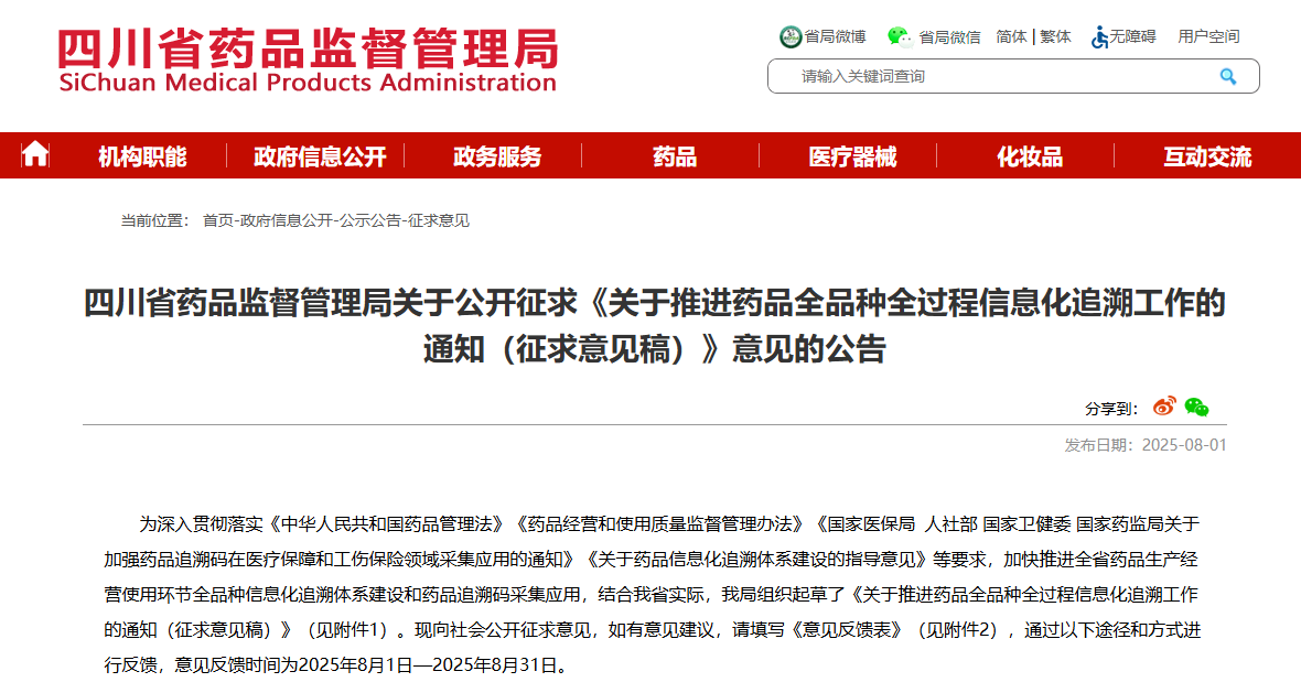 近日,四川省药监局发布《关于推进药品全品种全过程信息化追溯工作的通知》(简称《通知》),并向社会公开征求意见。
