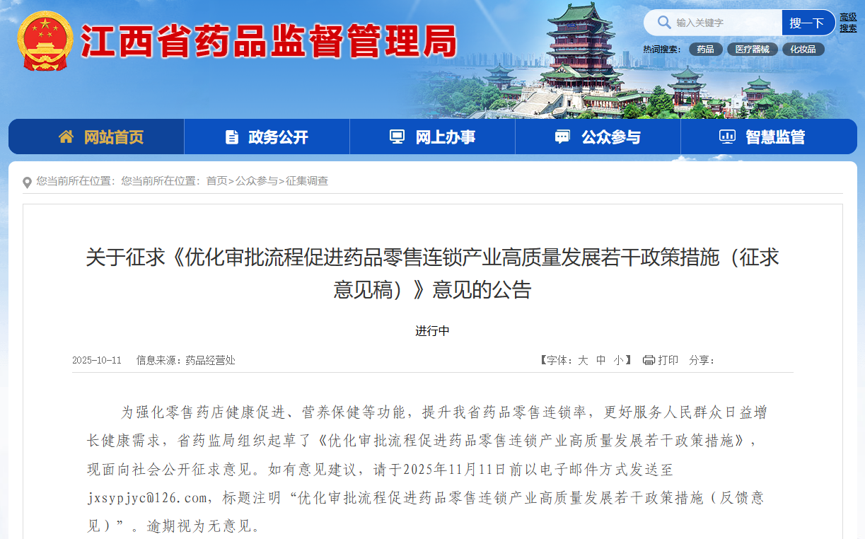 近日,江西省药监局发布《优化审批流程促进药品零售连锁产业高质量发展若干政策措施(征求意见稿)》,以强化零售药店健康促进、营养保健等功能,提升全省药品零售连锁率。