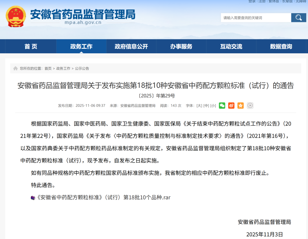 11月6日,安徽省药监局发布实施第18批10种安徽省中药配方颗粒标准(试行)的通告,自发布之日起实施。