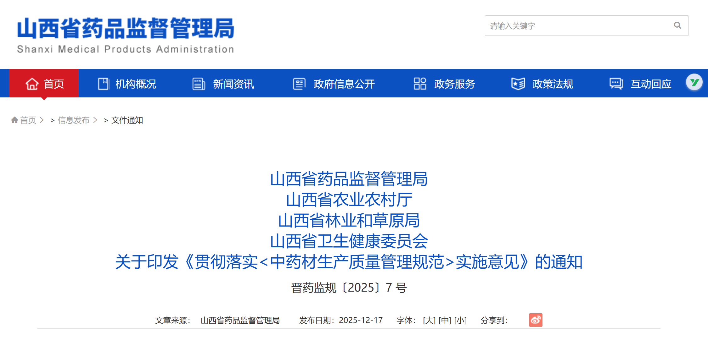 12月17日,山西省药监局、省农业农村厅、省林业和草原局、省卫健委联合印发《关于贯彻落实〈中药材生产质量管理规范〉实施意见》。