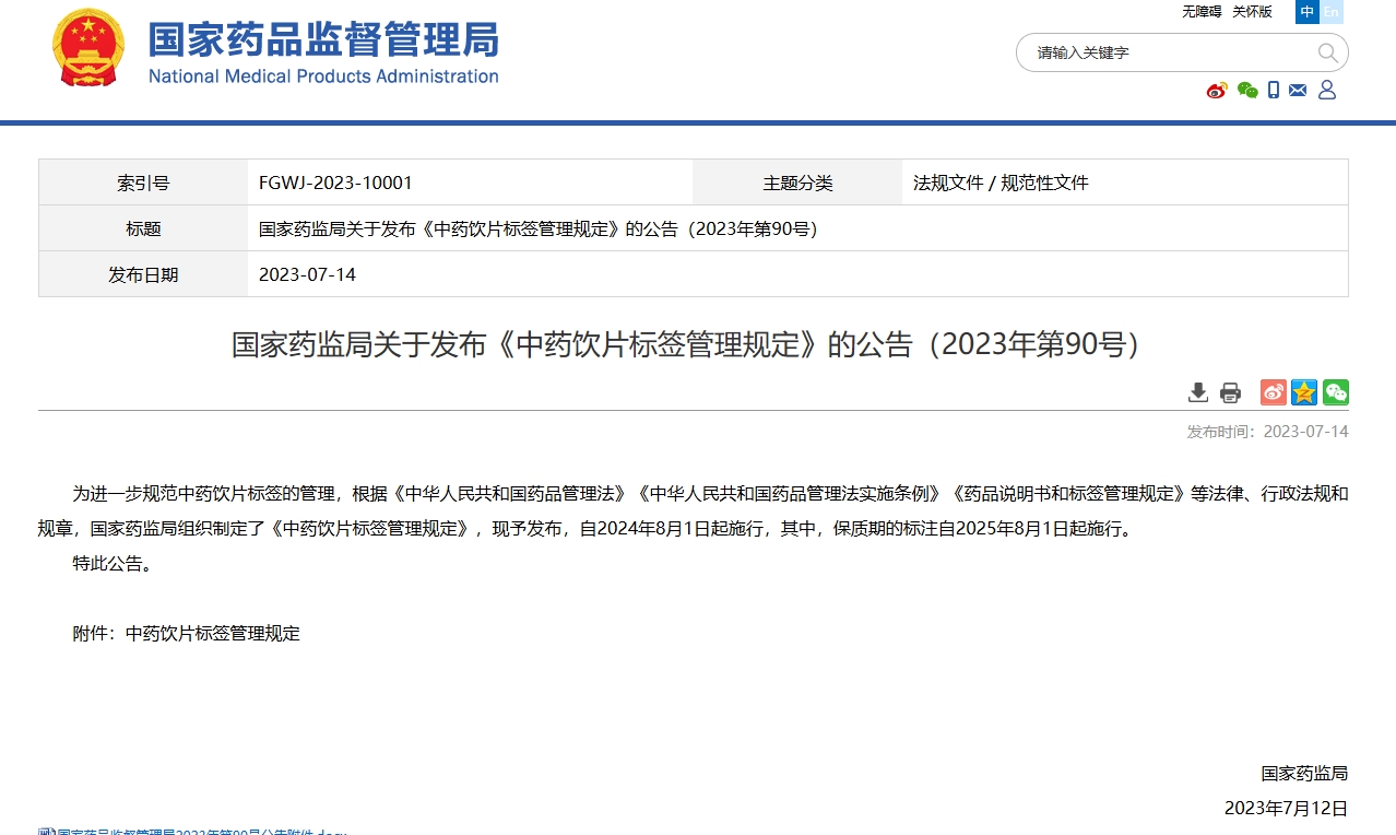 2023年7月14日,国家药品监督管理局发布《中药饮片标签管理规定》(以下简称《规定》),对中药饮片标签管理作出明确要求,提出标签内容应当标注保质期等。《规定》自2024年8月1日起施行,其中,保质期的标注自2025年8月1日起施行。与《规定》配套制定的《中药饮片标签撰写指导原则(试行)》《中药饮片保质期研究确定技术指导原则(试行)》于2024年7月28日发布,进一步指导饮片生产企业开展相关工作。
