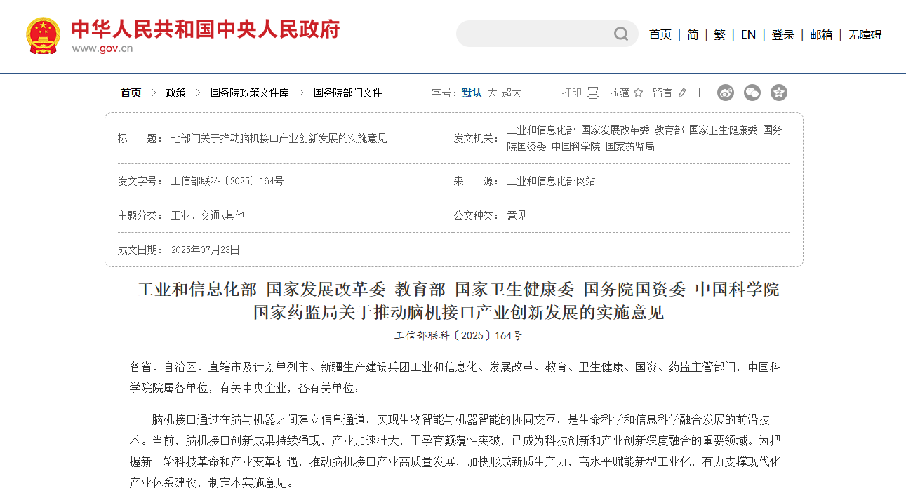 日前,工业和信息化部、国家发展改革委、教育部、国家卫生健康委、国务院国资委、中国科学院、国家药监局发布关于推动脑机接口产业创新发展的实施意见。
