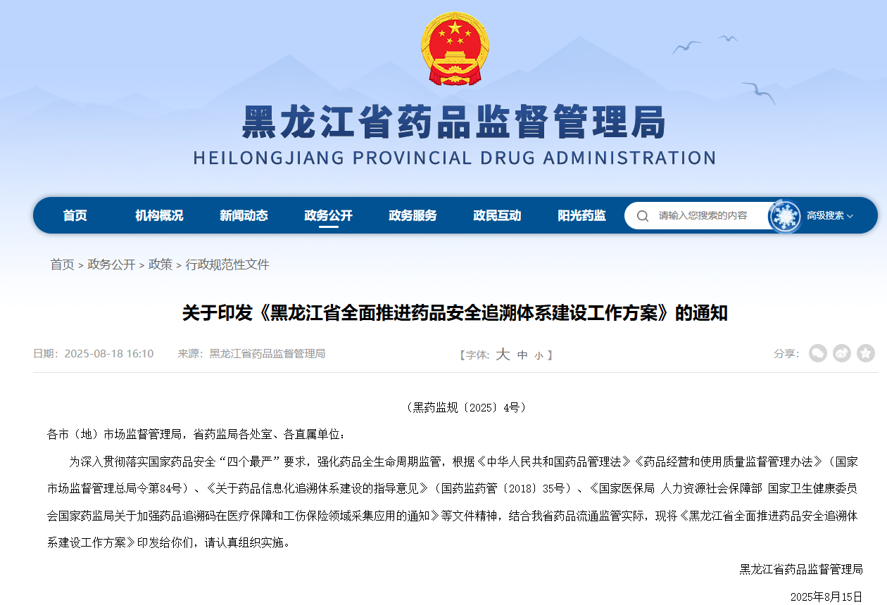 8月18日,黑龙江药监局发布了关于印发《黑龙江省全面推进药品安全追溯体系建设工作方案》的通知,要求自2026年1月1日起,除中药饮片、中药配方颗粒、院内制剂、个别体外诊断试剂,必须拆零发放的药品以及零散注射针剂等暂无赋码要求的药品以外,其他未赋码的药品原则上不得进入本省药品经营环节。