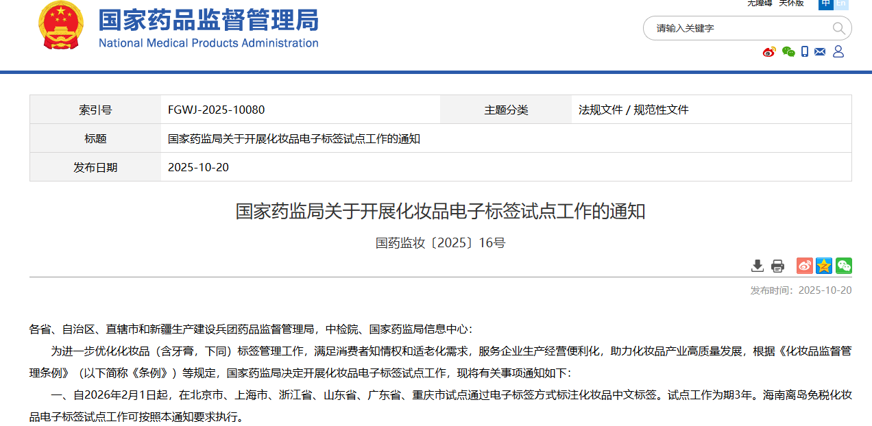 近日,国家药监局发布《关于开展化妆品电子标签试点工作的通知》,明确自2026年2月1日起,在北京、上海、浙江、山东、广东、重庆试点通过电子标签方式标注化妆品中文标签。试点工作为期3年。试点工作应当符合《化妆品电子标签试点工作要求》的规定,并按照《化妆品电子标签数据集》《化妆品电子标签二维码技术规范》要求建设化妆品电子标签系统。