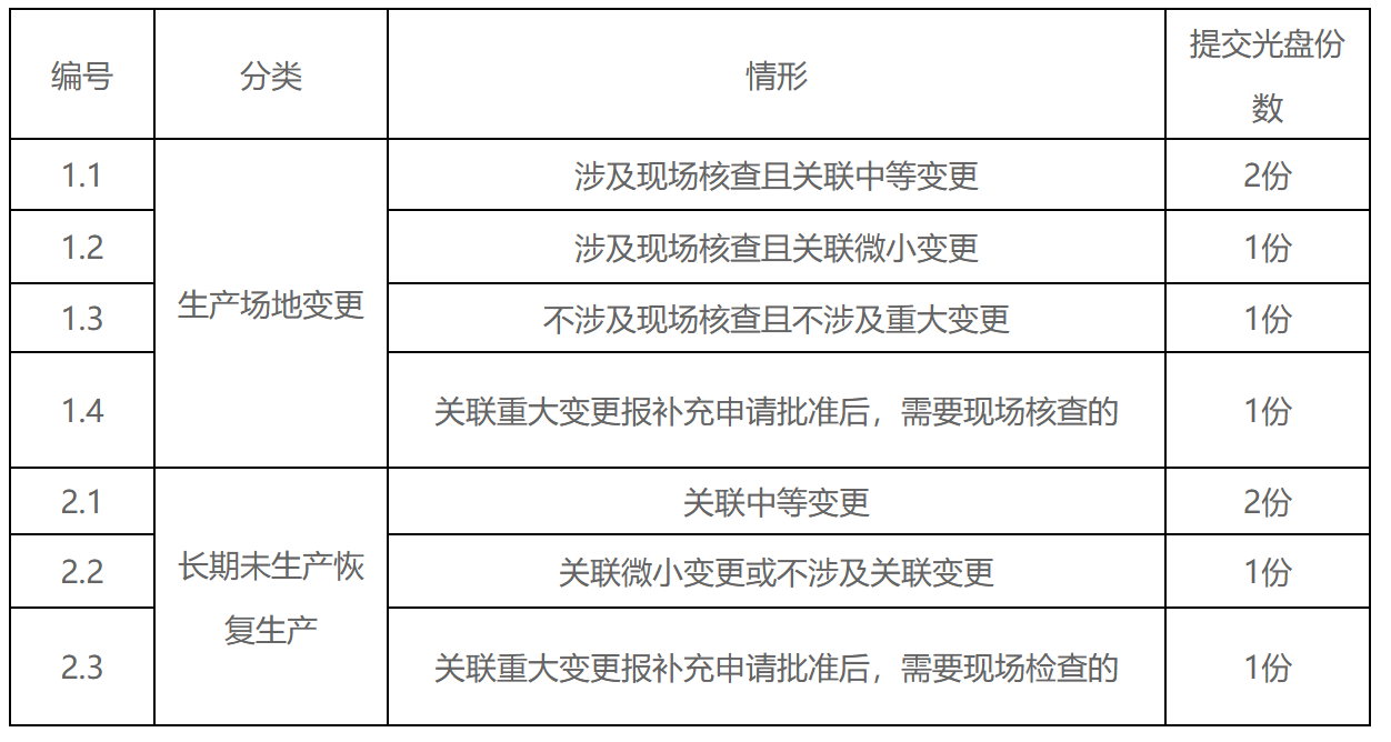 申请药品生产场地变更(涉及现场核查且关联中等变更)、长期未生产恢复生产(关联中等变更)需同时提交2份光盘资料。其他情形需提交1份光盘资料。光盘资料需注明品种及具体情形(详见附件)。