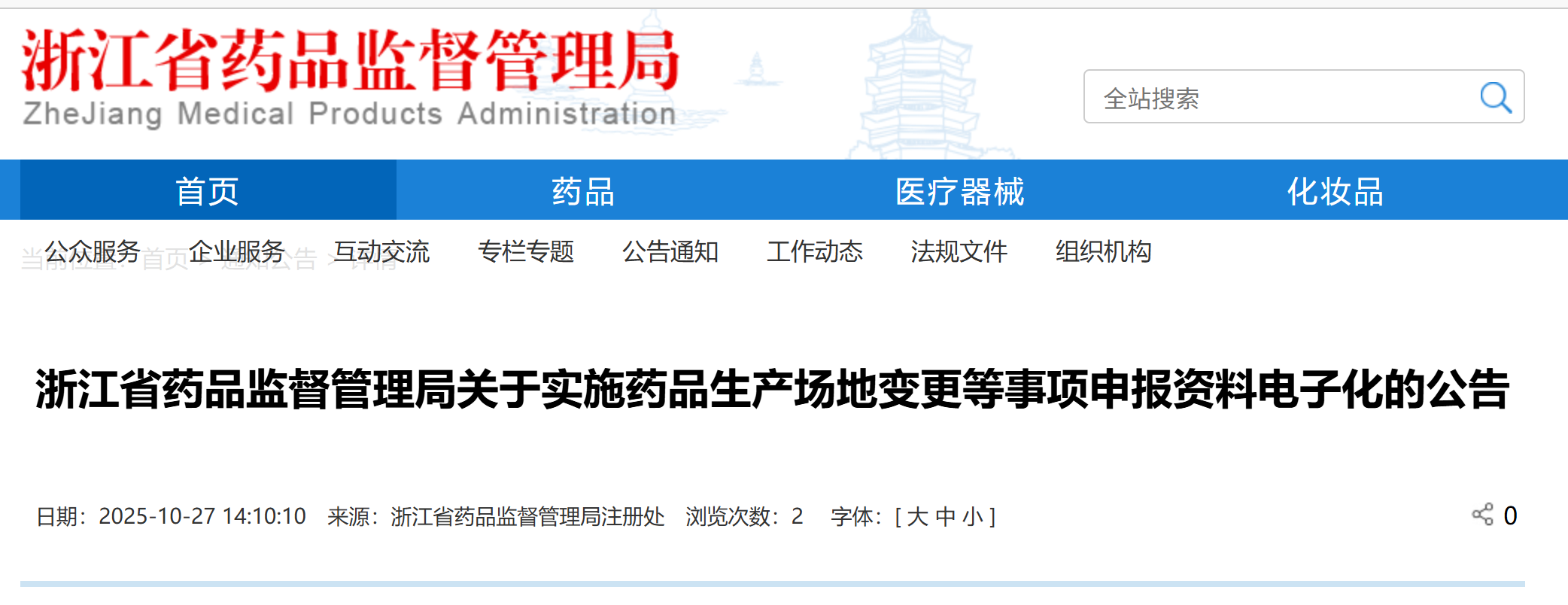 10月27日,浙江省药监局发布关于实施药品生产场地变更等事项申报资料电子化的公告。