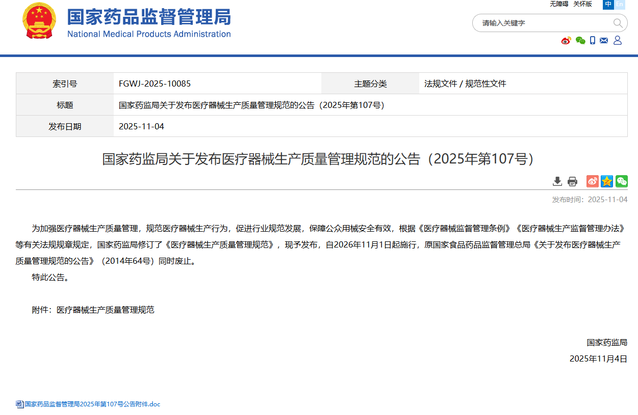 11月4日,国家药监局发布新版《医疗器械生产质量管理规范》(以下简称《规范》)。新版《规范》将于2026年11月1日起施行。