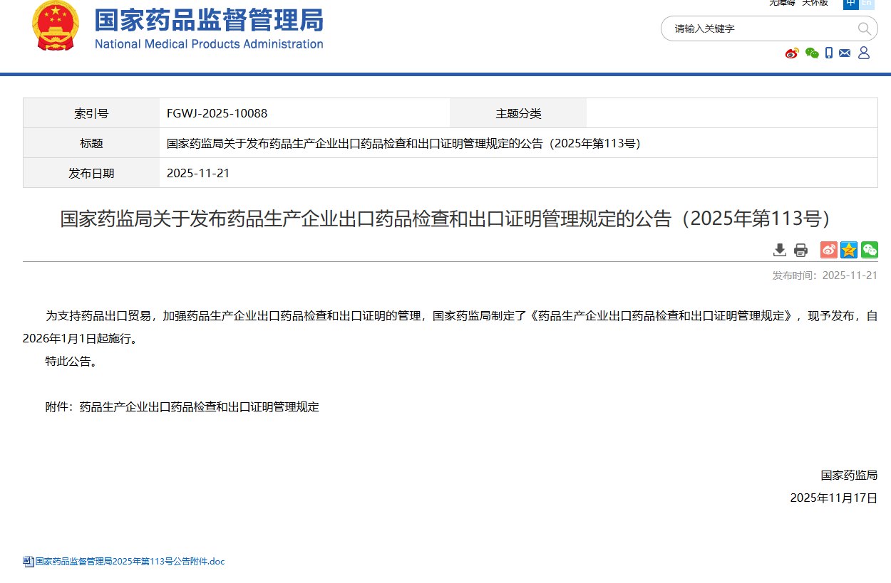 近日,国家药监局发布《药品生产企业出口药品检查和出口证明管理规定》,自2026年1月1日起施行。