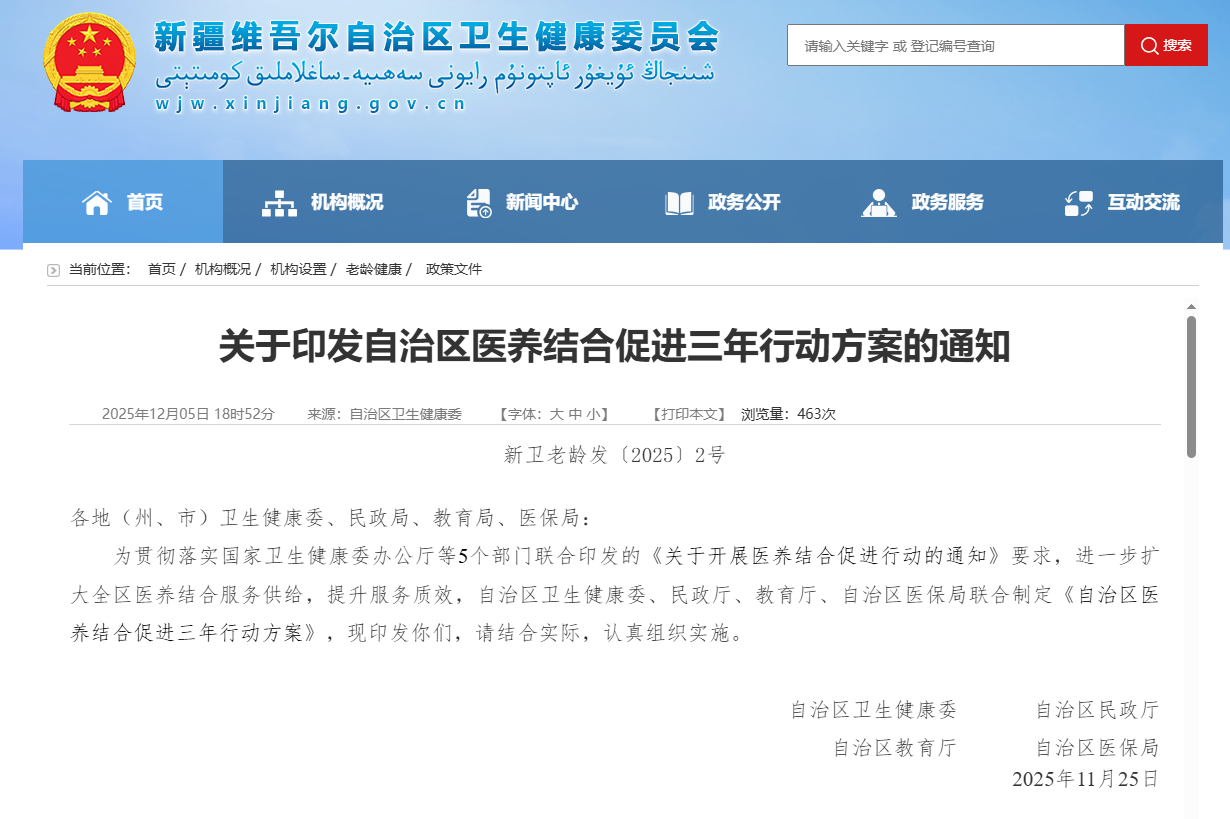 近日,新疆维吾尔自治区卫生健康委等四部门联合印发《自治区医养结合三年促进行动方案》,提出要提高中医药医养结合服务可及性,加强老年人中医药健康管理服务,到2027年,65岁及以上老年人中医药健康管理率达到77%以上。