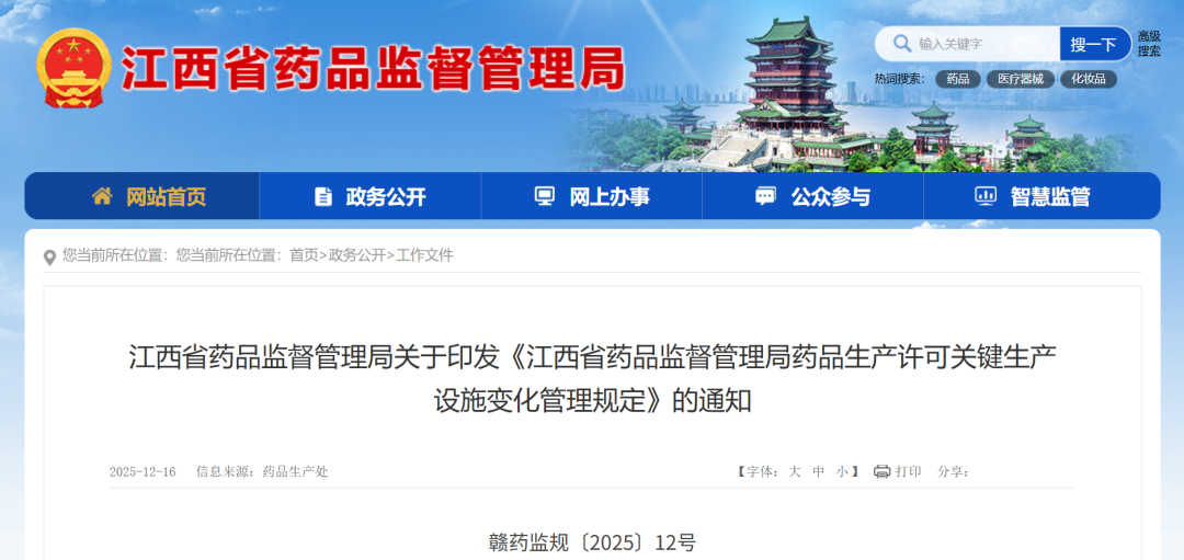 12月16日,江西省药品监督管理局印发《江西省药品监督管理局药品生产许可关键生产设施变化管理规定》的通知,自2026年2月1日起施行。