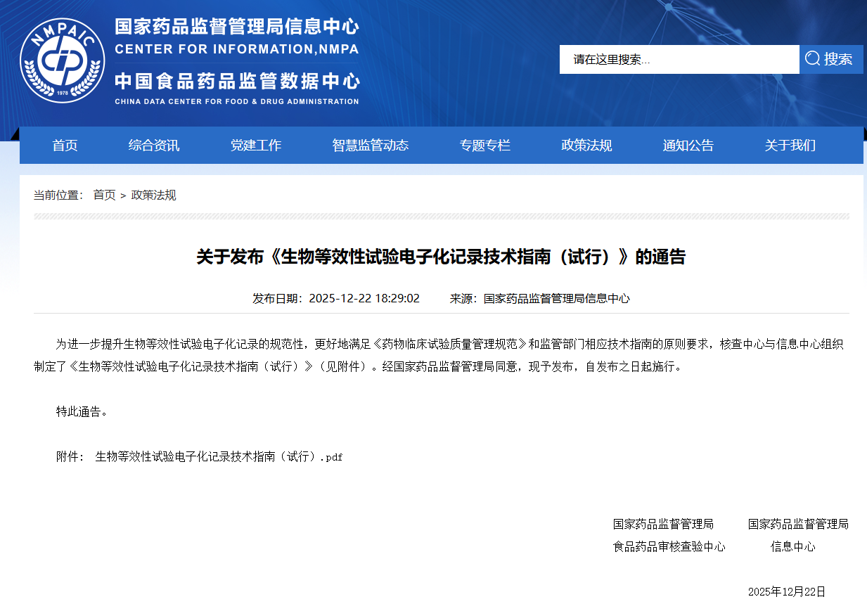 为进一步提升生物等效性试验电子化记录的规范性,更好地满足《药物临床试验质量管理规范》和监管部门相应技术指南的原则要求,近日,国家药监局核查中心与国家药监局信息中心制定发布了《生物等效性试验电子化记录技术指南(试行)》。